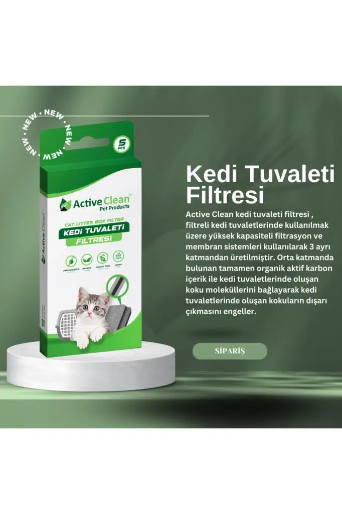 Active Clean Kedi Tuvaleti Filtresi Active Clean kedi tuvaleti filtresi Filtreli kedi tuvaletlerinde kullanılmak üzere yüksek kapasiteli filtrasyon ve membran sistemleri kullanılarak 3 ayrı katmandan üretilmiştir. Orta katmanda bulunan tamamen organik aktif karbon içerik ile kedi tuvaletlerinde oluşan koku moleküllerini bağlayarak kedi tuvaletlerinde oluşan kokuların dışarı çıkmasını engeller. Active Clean Kedi Tuvaleti filtresi buhar aktivasyonu ile üretilen, yüksek yoğunluklu ve orta aktiviteye sahip granüler aktif karbon içerir. Active Clean güçlübir karbon yapıya sahip ve son derece dayanıklı bir üründür . Kedi kumlarından idrar asidi, kreatin gibi oksitleyici maddelerin giderilmesini sağlar. Ürün Ölçüleri : 20cm * 9 cm 5 Adet filtre Kullanım Önerisi : 1 yetişkin kedinin kullandığı kedi tuvaleti için ActiveClean Kedi Tuvaleti Filtresi yaklaşık 45 günlük periyotlarda değiştirilmelidir. Ancak filtre değişim süresi kedinizin yaşına, cinsine, kilosuna ve tuvalete girme sıklığına göre değişkenlik gösterebilir. Active Clean Kedi Tuvaleti filtre boyutu kedi tuvaletinizin haznesine uymadığı durumlarda kesilerek boyut uygun hale getirilebilir. Kesim işlemi filtrede herhangi bir deformasyona sebep olmaz.