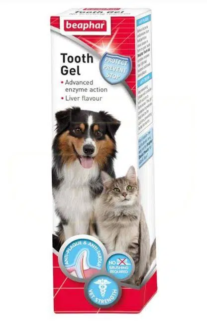 Köpekler ve kediler için, gelişmiş enzim etkisi ile fırça kullanmadan plak ve tartar oluşumunu önleyen, diş temizliğini ve ağız sağlığını koruyan, ağız kokusunu gideren, ciğer aromalı diş jeli.