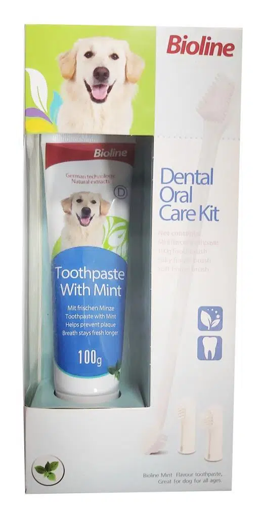 Bioline, köpek diş fırçası ve macunu bulunan diş bakım setidir. Köpeklerde ağız ve diş sağlığı oldukça önemlidir. Dişlerde tartar birikimi ve plak oluşumunu önlemek için köpeğinizin kemirebileceği köpek diş ipleri veya kauçuk köpek oyuncakları kullanabileceğiniz gibi köpek diş macunuyla da ağız ve diş sağlığını desteklemeniz gerekir. Bioline diş macunu köpeğinizin ağzında hoş bir tat bırakmanın yanı sıra dişlerin genel sağlığını desteklemeye de yardımcı olur.