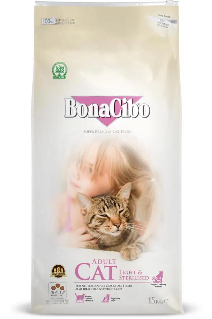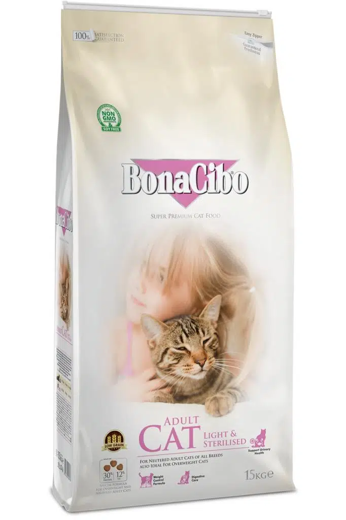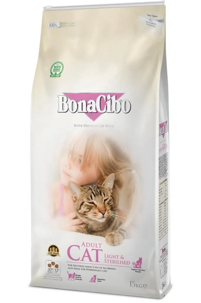 BonaCibo Adult Cat Light & Sterilised, kısırlaştırılmış veya kilolu kediler için formüle edilmiştir. Kilo kontrolünün sağlamasına yardımcı olurken lezzetli bir mamada tüm temel besinleri sunacak şekilde dikkatle dengelenmiş protein ve yağ seviyelerini içerir. Ayrıca besin maddesi olan tahılı düşük miktarda içererek kedinizin sağlıklı olarak yaşamını sürdürmesine yardımcı olur