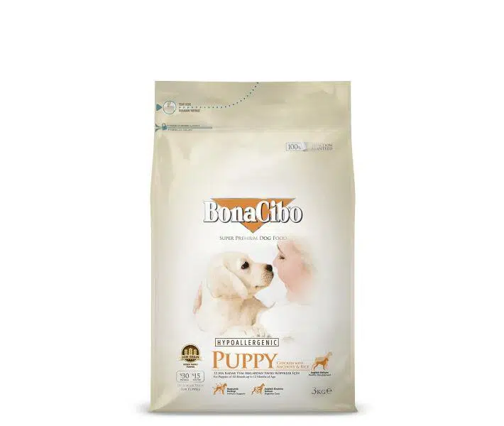 BonaCibo Puppy, sağlıklı deri yapısını ve parlak tüylerin oluşumunu desteklemek üzere vitaminler ve amino asitlerce zenginleştirilmiş, Omega-6 : Omega-3 yağ asitleri oranı dengelenmiş özel içeriğe sahiptir.