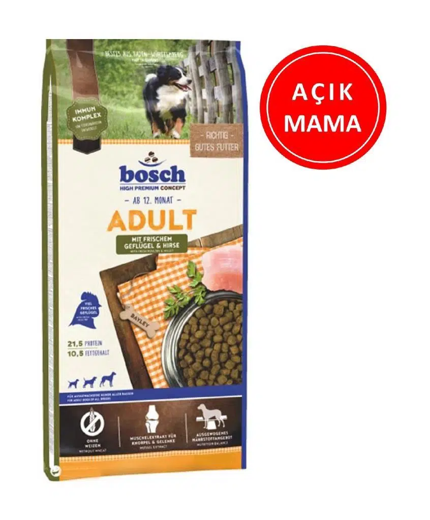 Yetişkin sevimli dostlarımıza kesinlikle hayır diyemeyecekleri tavuk etli mama. Bosch tavuklu mama normal faaliyet seviyesine sahip tüm yetişkin köpekler için dengeli, komple bir yiyecektir. Bosch Tavuklu mamanın özel tarifi sayesinde sindirimi oldukça kolay olmakla beraber, lezzeti de eşsiz olan mama ile köpeğinizi ödüllendirin.