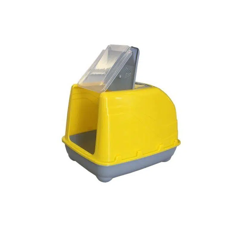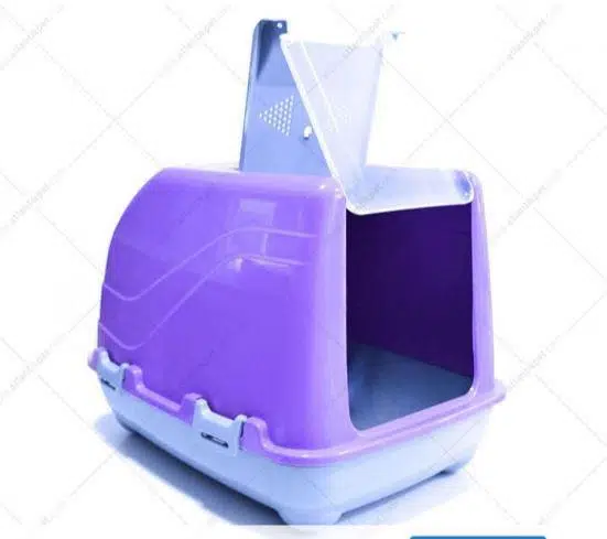 Kediler için, tuvalet ihtiyaçlarını giderirken oluşan kötü kokuların giderilmesini sağlayan, filtreli ve kapılı tuvalet kabı.