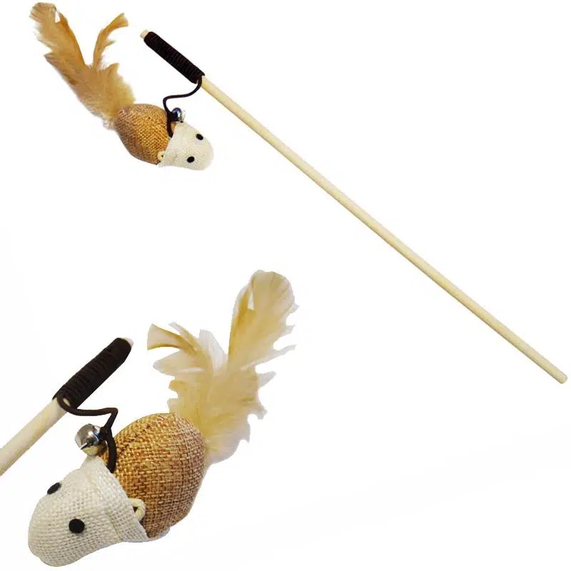 40 cm ahşap sap uzunluğuna 55 cm elestik ip ve olta ucunda hasır peluş ve çıngırak bulunan kedi oltası.
