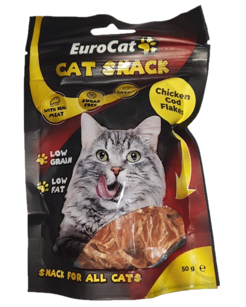 EuroCat Tahılsız Şekersiz Kurutulmuş Et Cat Chicken Cod Flakes Kedi Ödülü 50 Gr