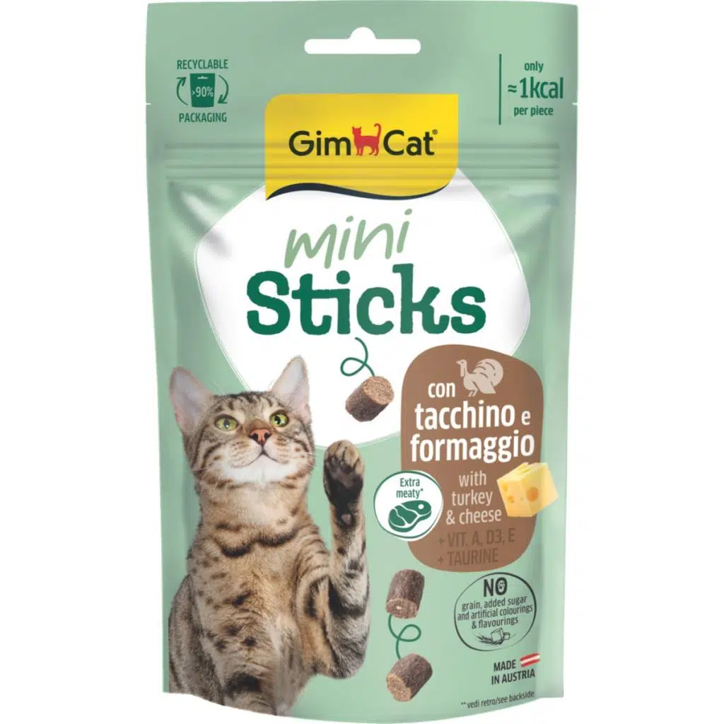 GimCat Mini Sticks hindili ve peynirli, kediniz için yüksek et içeriğine sahip, karşı konulamaz derecede lezzetli bir atıştırmalıktır.İçeriğinde Vitamin A, D4, E Vitamini ve Taurin bulunmaktadır. Şeker ilavesiz. Yapay renklendirici ve tatlandırıcı içermez.