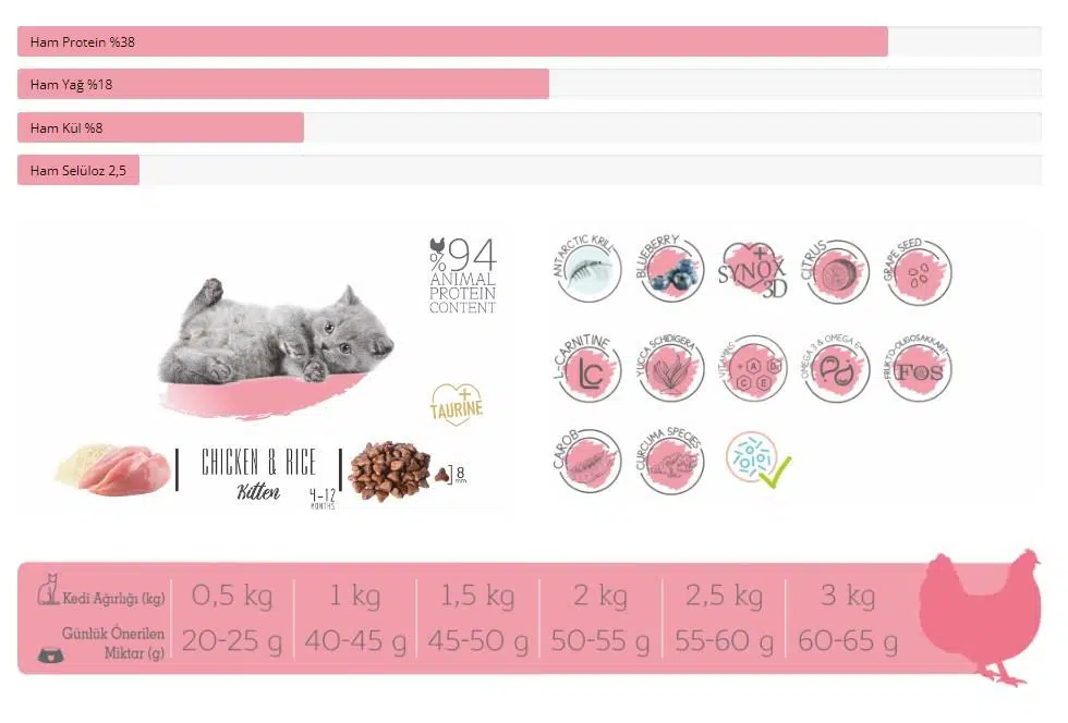 Yavru kediler için 1 yaşına kadar kullanılması gereken, tavuk eti ve pirinçli, yavruların gelişimi için ihtiyaç duydukları tüm vitamin ve mineralleri içeren, düşük tahıllı kuru mama.