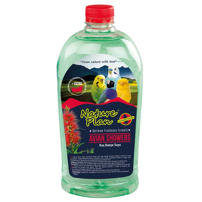 Nature Plan Avian showers kuşlar için özel olarak formüle edilmiş mineral ve iyot açısından zenginleştirilmiş banyo suyudur. Özel içeriği sayesinde mantar ve diğer deri hastalıklarının oluşumlarının engellenmesinde yardımcı olur.