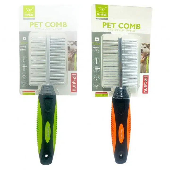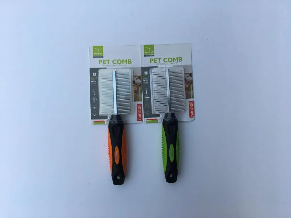 Evcil hayvanların topaklaşan (kıtıklarsan) normal fırçalarla taranamayacak şekilde birbirine karışmış olan tüylerini açmada kullanılmak için özel olarak tasarlanmış, ergonomik saplı, farklı kalınlıklarda tellerden oluşan Nunbell çift taraflı tüy açma tarağı.