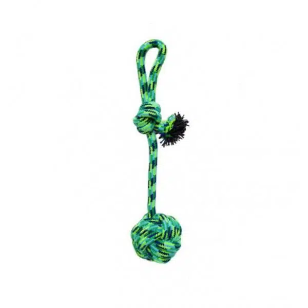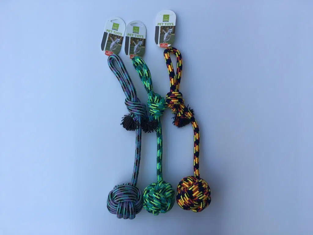 Köpekler için renkli halatlardan yapılmış uç kısmında halat sarılarak oluşturulmuş top bulunan