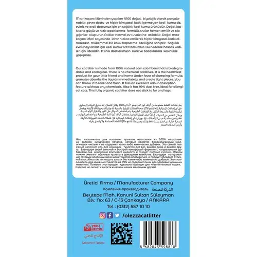 Tuvalet kabınızı temizlerken kedinizin sağlığı için kimyasal madde içeren temizlik malzemelerini kullanmayınız. Tuvalet kabına 7 cm. yüksekliğinde olacak şekilde doldurunuz. Kirlenmiş kısımları atarak eksilen miktar kadar ilave ediniz. Kullanımdan sonra atıkları gönül rahalığı ile klozete atabilirsiniz. Mısır koçanı liflerinden yapılan %100 doğal, biyolojik olarak parçalanabilir, çevre dostu ve hiçbir kimyasal katkı içermeyen kedi kumu siz, eviniz ve evcil dostunuz için en sağlıklı kedi kumu ürünüdür. Doğal katkılarla güçlü ve hızlı topaklanma formülü, sıvılar hemen emilir ve sıkı yığınlar oluşturur. Atıklar normal ev tuvaletine atılabilir. Doğal mısır koçanı lifleri sayesinde idrar hızlıca emilerek hiçbir kimyasal katkı olmaksızın mükemmel bir koku hapsetme özelliğine sahiptir. Sağlıklı evcil hayvanlar için kedi kumu %99 tozsuzdur. Bu nedenle hassas kediler için idealdir. Minik dostlarımızın kürk ve bacaklarına kesinlikle yapışmaz.