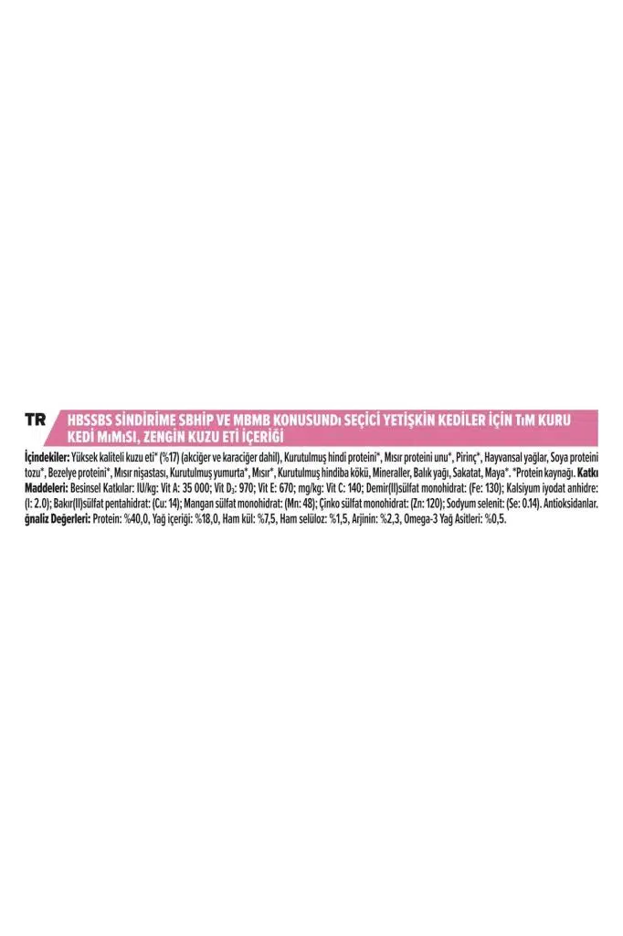 Mamanın İçeriği; Kuzu Eti, pirinç , pirinç gluten unu, hayvansal yağ karışık tokoferoller ile korunmuş mısır, gluten unu, kurutulmuş türkiye protein mısır bütün yumurta kurutulmuş, sindirmek, pancar posası, balık yağı, maya, potasyum klorür, kalsiyum karbonat, mineraller, kolin klorür, L-arginin, L-lizin, sodyum klorür, DL-metiyonin.