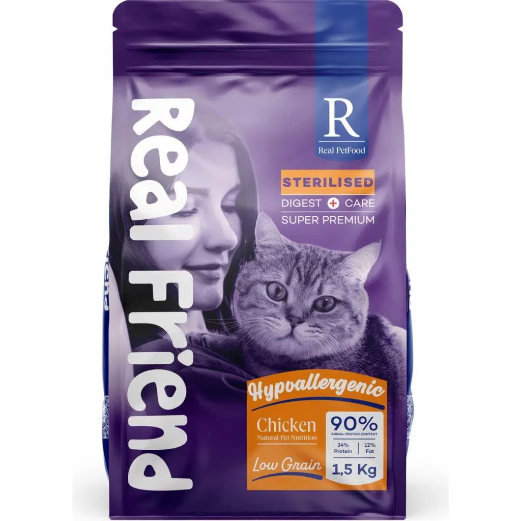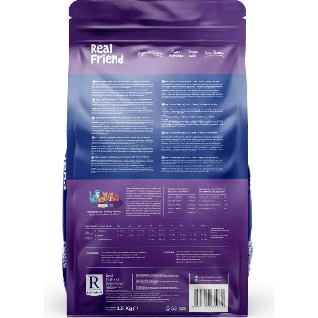 | Etiketler | Real Friend Digest Care Hypoallergenic Sterilised Chicken 34/12 Kedi Maması 1,5 Kg |
