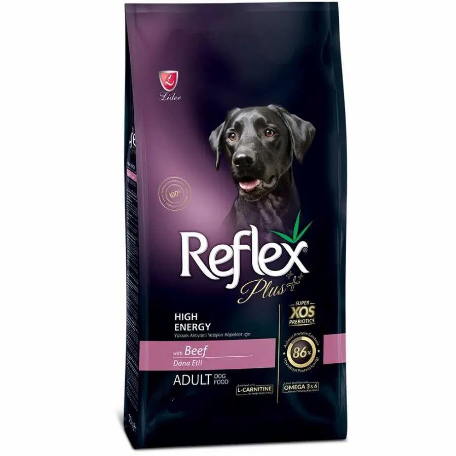Reflex Plus High Energy with Beef Adult dog, yetişkin ve yoğun enerji sarf eden köpeklerin günlük beslenme ihtiyaçlarını karşılamak üzere kedi/köpek beslenme uzmanları tarafından özenle formüle edilmiş tam ve dengeli, sığır eti proteini içeren super premium köpek mamasıdır.