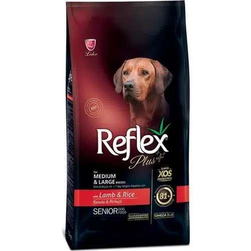 Reflex Plus for Medium Large Breeds +7 Senior Lamb Rice, 7 yaş üzeri orta ve büyük ırklar için günlük beslenme ihtiyaçlarını karşılamak üzere kedi/köpek beslenme uzmanları tarafından özenle formüle edilmiş tam ve dengeli, kuzu proteini içeren süper premium köpek mamasıdır.