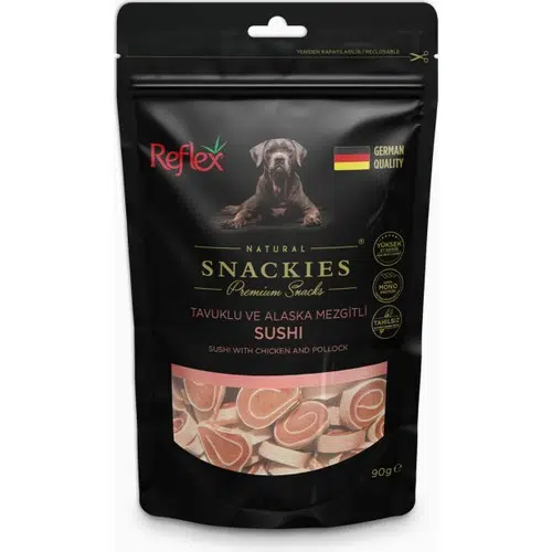 Reflex sanackies tavuklu ve balıklı sushi köpek ödül maması; Köpekler için özel olarak formüle edilmiştir. Köpek ödül maması; Öğünler arası sağlıklı tamamlayıcı mamadır. Her zaman taze içme suyu bulundurulması önerilmektedir. Yağ oranı düşük olarak üretilmiştir. Yapay renklendirici, aroma verici ve koruyucu içermez. Köpek ödülü; Kolay sindirilebilirlik özelliğine sahiptir.