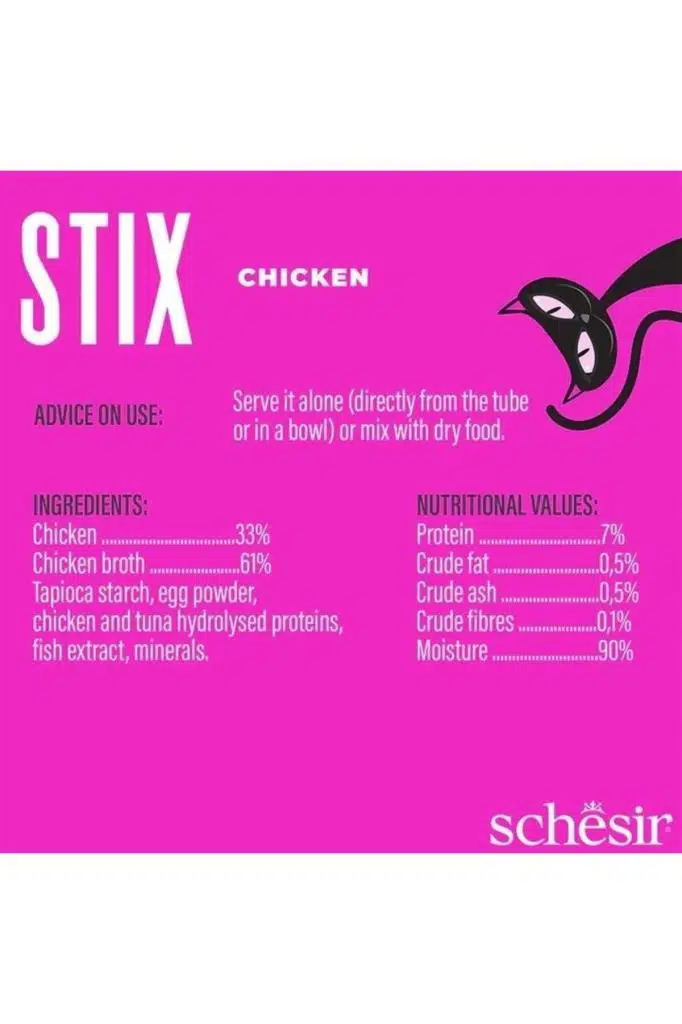 Schesir cat stix tavuklu krema kedi ödülü 6x15gr Kremalı köpük içinde tavuk etinden elde edilen protein açısından zengin atıştırmalık. Bileşim: tavuk pişirme suyu %61, tavuk %33, tapyoka nişastası,yumurta tozu, tavuk ve ton balığı proteinleri, balık ekstraktı, mineraller. Analitik bileşenler: protein %7, ham yağ %0,5, ham kül %0,5 ham selüloz %0,1, nem oranı %90.