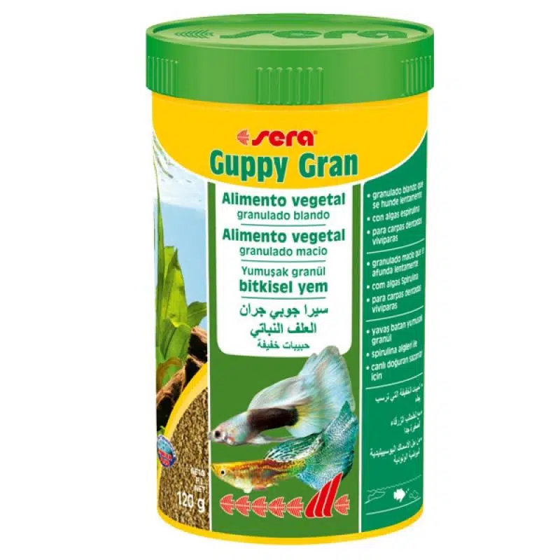 Sera guppy gran lepistesler ve diğer küçük balıklar için değerli bitkisel elemanlar içeren özel bir besindir. Parlak renkler, sağlıklı gelişim, güçlü bir bağışıklık sistemi, doğurganlık ve canlılık için dikkatli işlemden geçirme ve içerik seçimi.
