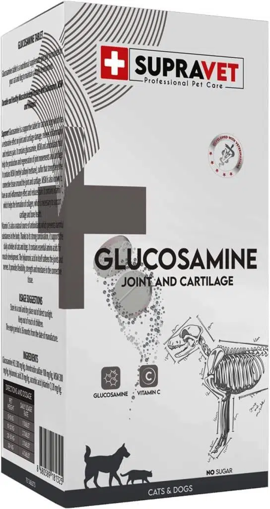 Supravet Glukozamin tablet, kedi ve köpekler için, eklem ve kıkırdak hasarlarında onarıcı etki yapan, yangı gidererek ağrıyı azaltan, eklem destek tabletidir.
