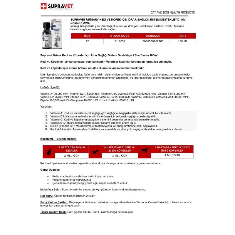 | Etiketler | Supravet Urinary Kedi ve Köpek İçin İdrar Sağlığı Destekleyici 100 ml |