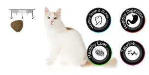 İçindekiler: Dehidre Tavuk Proteini (%39), Baldo Pirinç (%15), Mısır, Rafine Tavuk Yağı, Karides Unu, Bira Mayası, Hidrolize Tavuk Ciğeri, Hamsi Yağı, Nükleotit İçerikli Maya, Mineraller, Prebiotik Mannan Oligo Sakkaritler, Deniz Yosunu, Avizeağacı Özütü, Kızılcık Tozu, Pisilyum, Taurin.